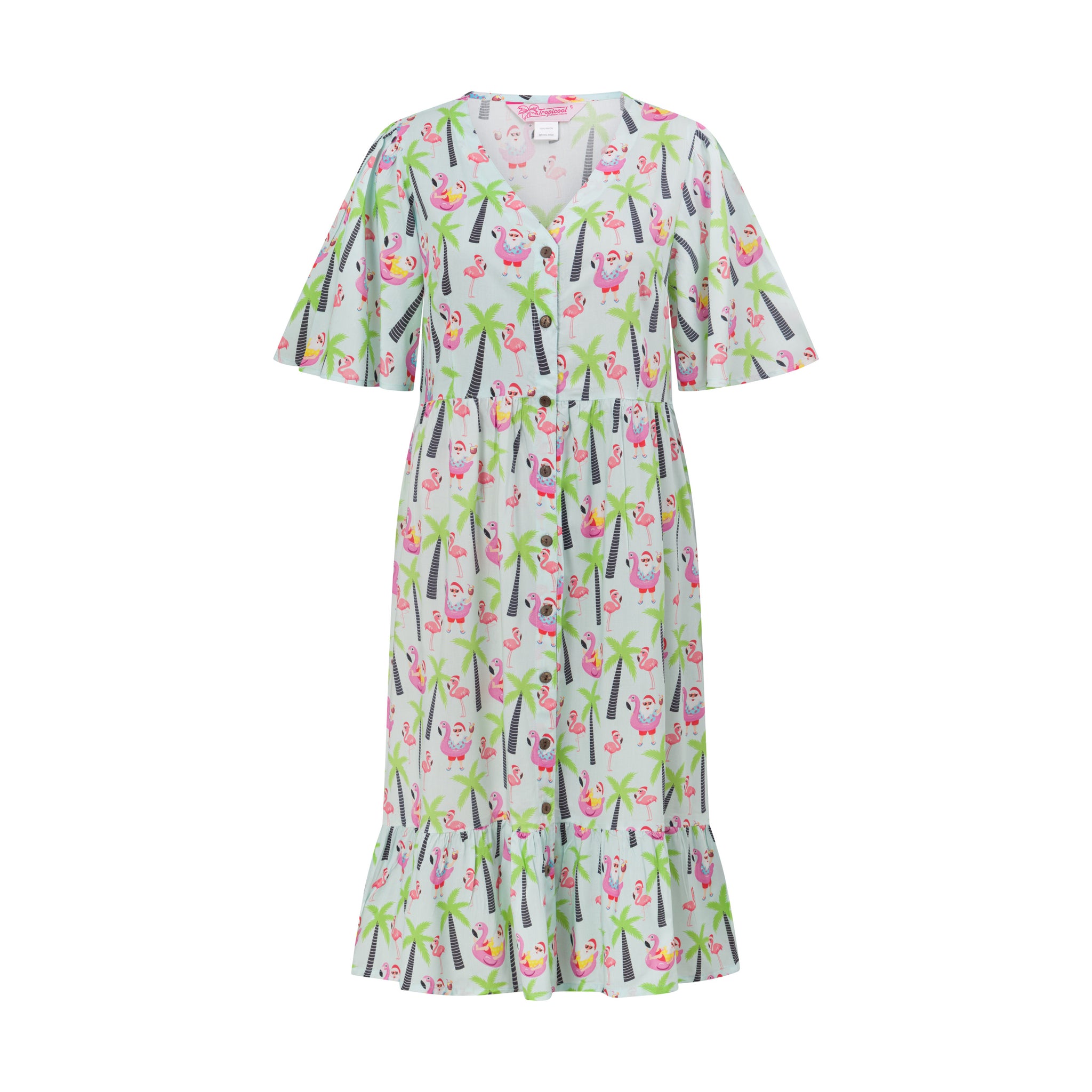 Christmas in the sun never looked so good! This playful dress is splashed with flamingos, palm trees, and Santa soaking up the holiday spirit. With functional buttons (practical and stylish), a waist tie belt for the perfect fit, and a relaxed, breezy shape, it’s designed for all-day comfort.