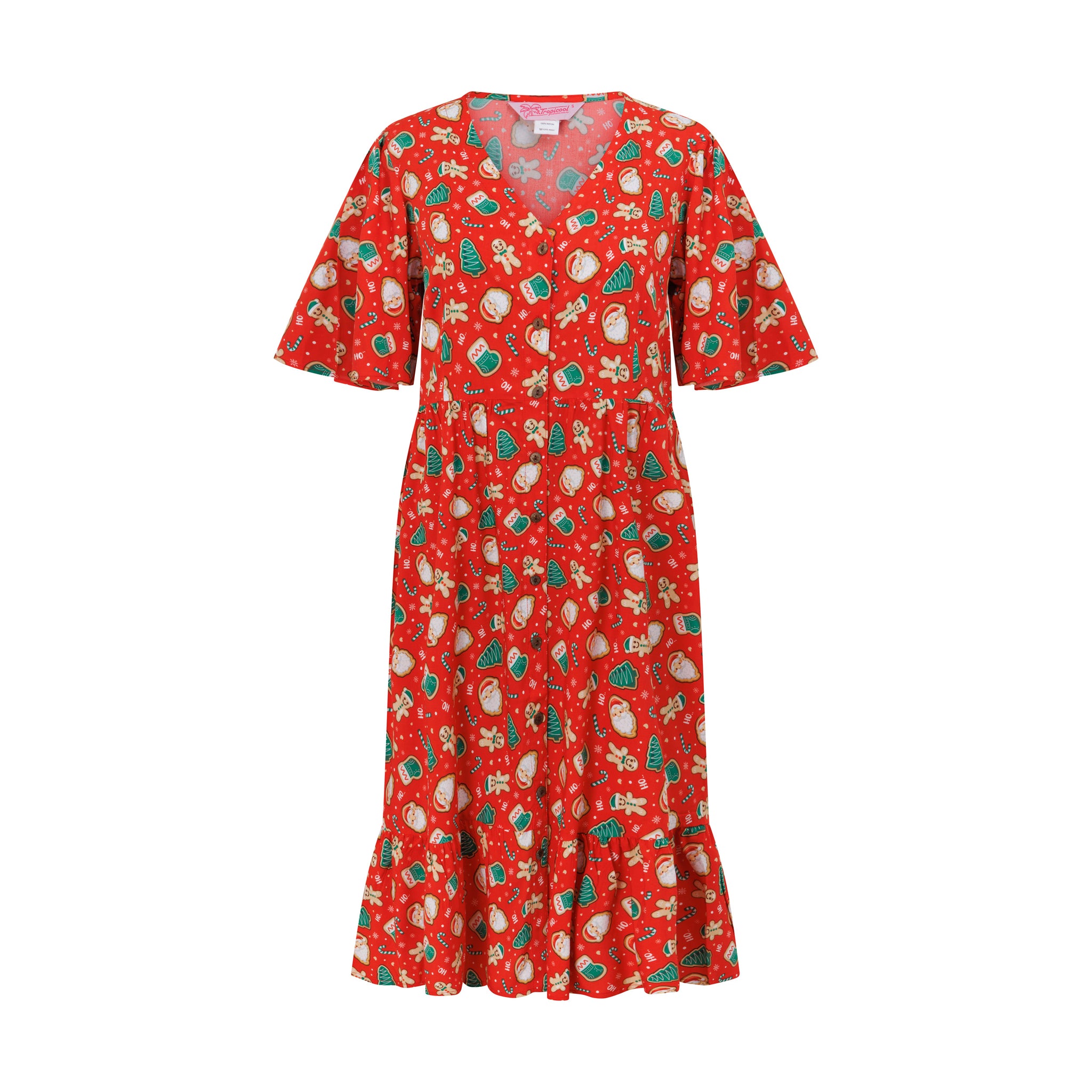 Bring a little extra joy to the season with this festive favourite! Featuring functional buttons (practical and pretty), a waist tie belt for the perfect fit, and a playful print full of Christmas cheer, this dress is as comfy as it is charming.