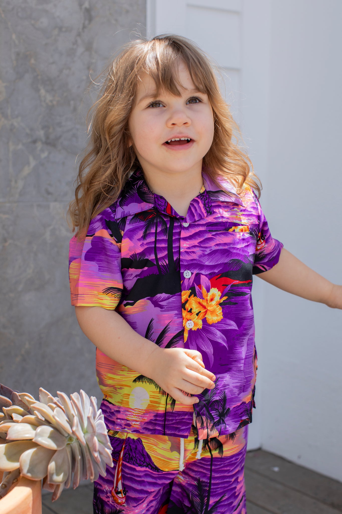Bright, bold and made for summer fun, the Sunset Purple Kids Hawaiian Shirt and Shorts Set is a standout warm-weather outfit. Featuring a vibrant purple tropical print inspired by sunset hues, this matching set is lightweight, breathable and designed for all-day comfort.